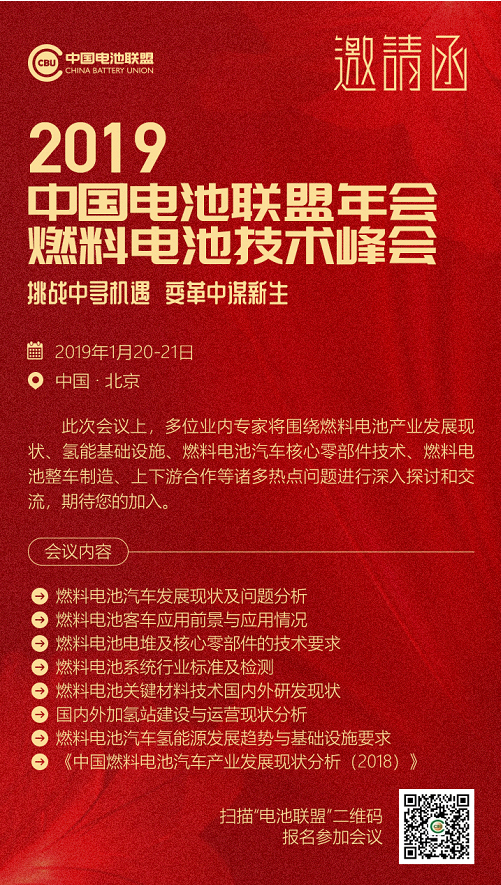 2019年1月20至21日,中國(guó)電池企業(yè)聯(lián)盟年會(huì)暨全國(guó)氫燃料電池汽車產(chǎn)業(yè)技術(shù)峰會(huì)將在京召開。本次峰會(huì)由中國(guó)電池聯(lián)盟、中國(guó)電子節(jié)能技術(shù)協(xié)會(huì)電池專委會(huì)、中國(guó)高科技產(chǎn)業(yè)研究會(huì)、清華大學(xué)、北京理工大學(xué)聯(lián)合舉辦。